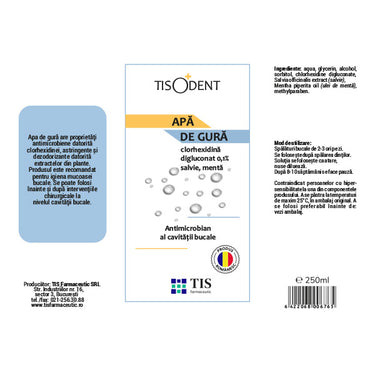 Utilizare: Se recomandă spălături bucale cu TISODENT Apa de gura-clorhexidina 0,1%, de 2-3 ori pe zi, timp de 8-10 săptămâni. După utilizare, timp de 30 de minute, nu este recomandat periajul sau consumul de alimente.